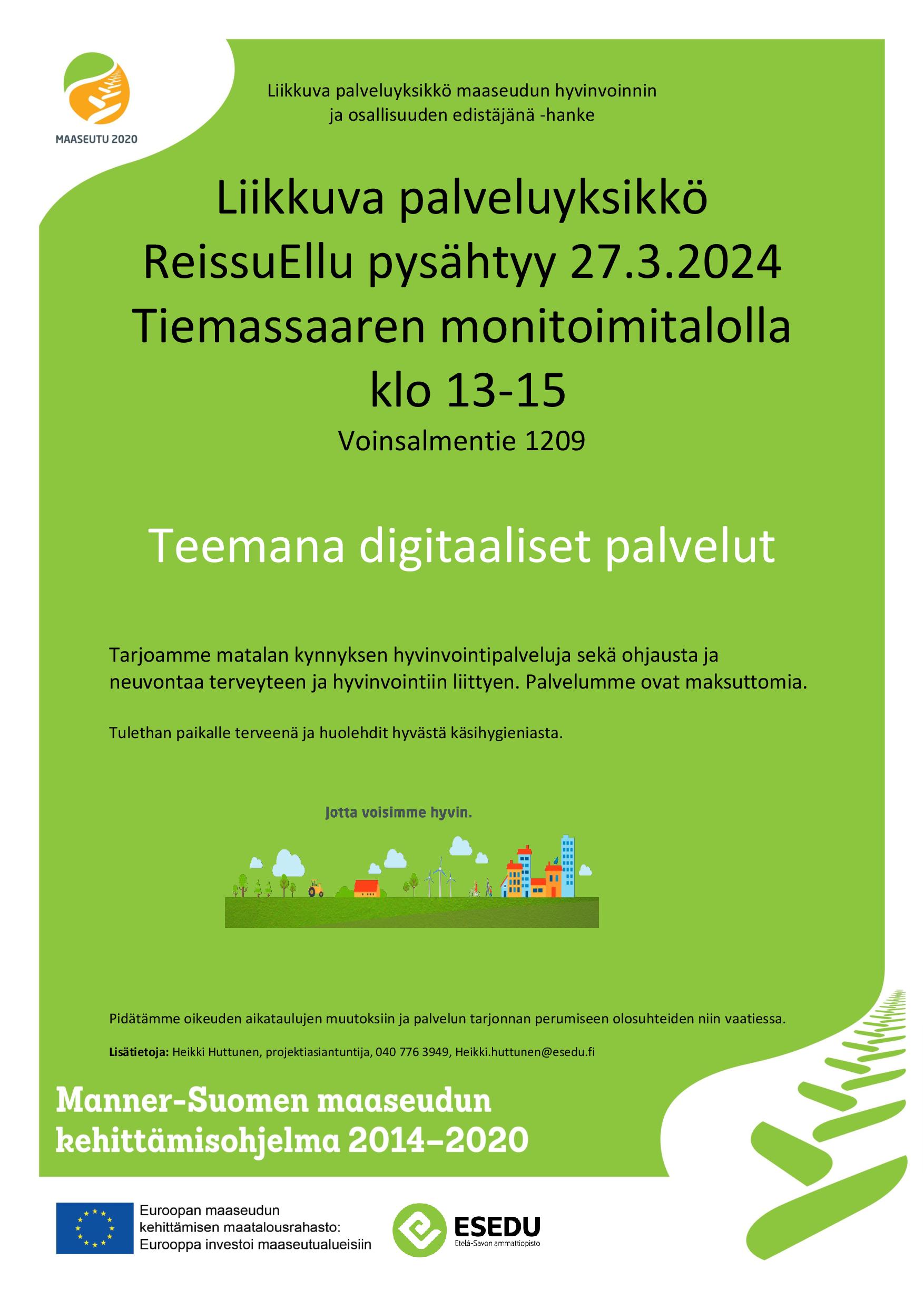 ReissuEllu jatkaa kyläläisten tapaamisia Tiemassaaren monitoimitalolla aina syksyisin. Tilaisuuteen ovat kaikki tervetulleita ja osallistujille maksuttomia. TERVETULOA MUKAAN!