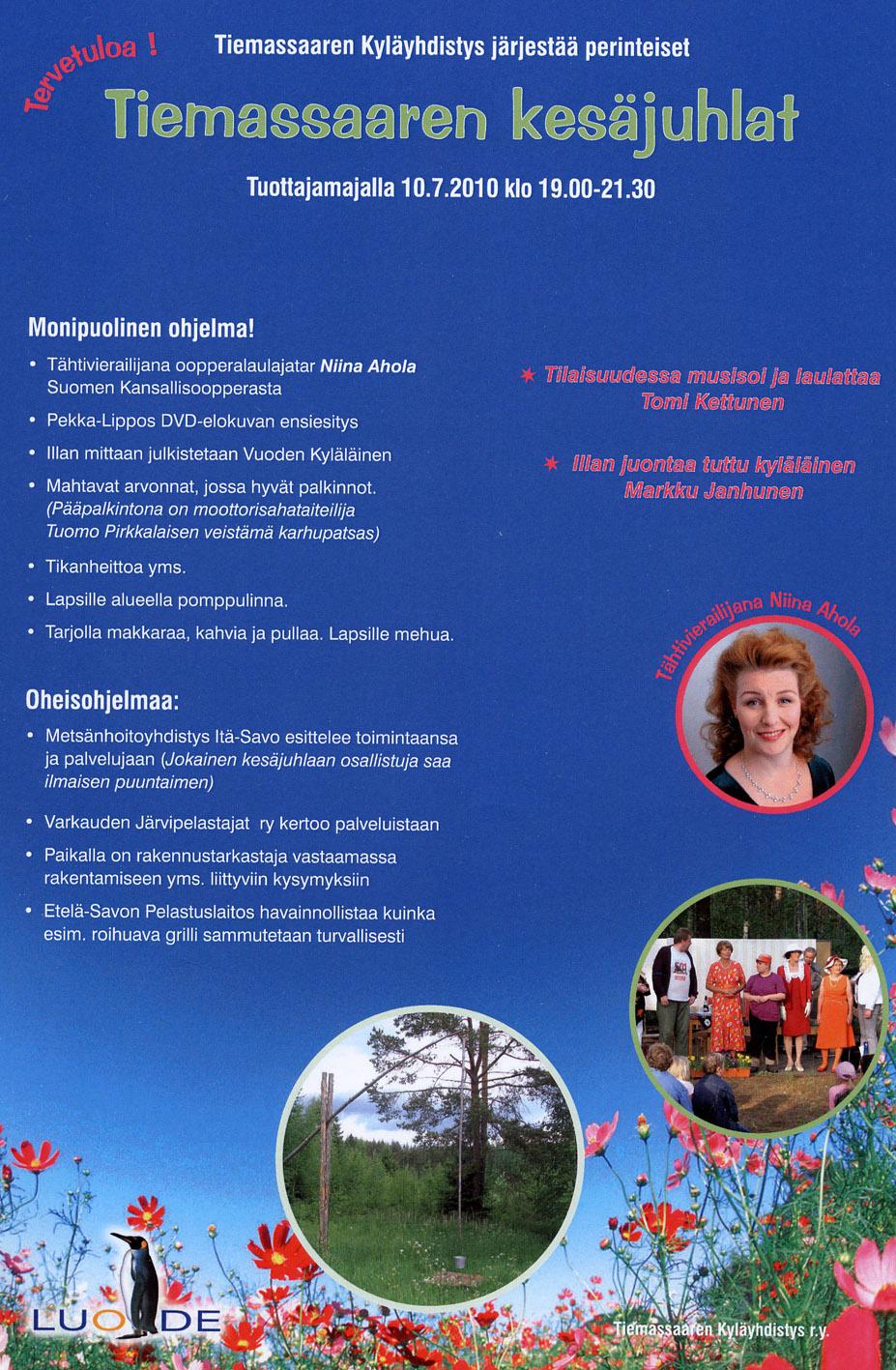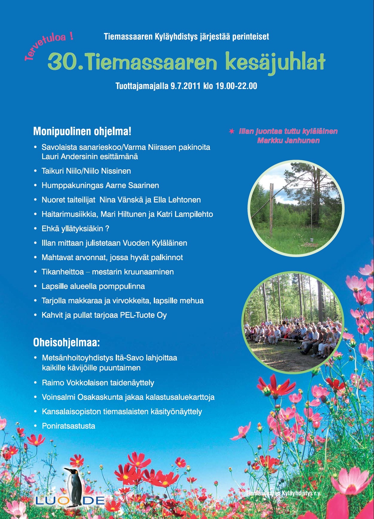 Kyläyhdistys on järjestänyt jo yli 30 kertaa kesäjuhlat, yleensä heinäkuun alkupuolella. Jo traditioksi muodostuneet juhlat on pidetty viimeaikoina Tuottajamajan viihtyisässä ympäristössä Rantasalmen tien varrella. Alla näet viimeisimpien juhlien ilmoitukset ohjelmatietoineen.